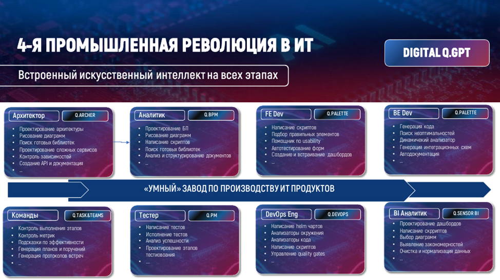 Центральной темой мероприятия стала экосистема Digital Q, предназначенная для промышленного производства программных продуктов, в которой low-code, микросервисная архитектура и искусственный интеллект (ИИ) формируют единый цифровой конвейер разработки.