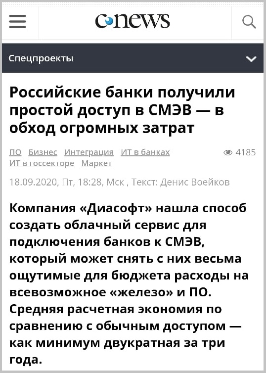 Что касается банков (99% от их числа), то, как поясняют в «Диасофте», они сейчас взаимодействуют через СМЭВ с широким перечнем ГИС, тем или иным образом оплачивая доступ к каждой из них.
