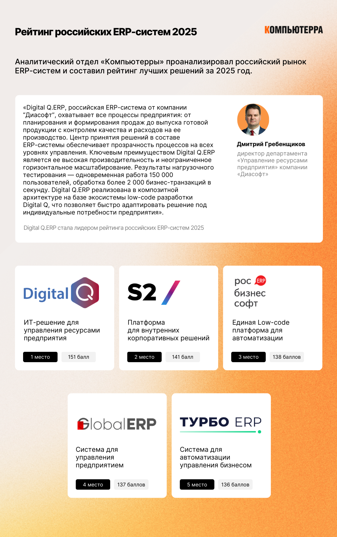 Лидером рейтинга российских ERP-систем стала Digital Q.ERP от компании «Диасофт», набрав 151 балл.
