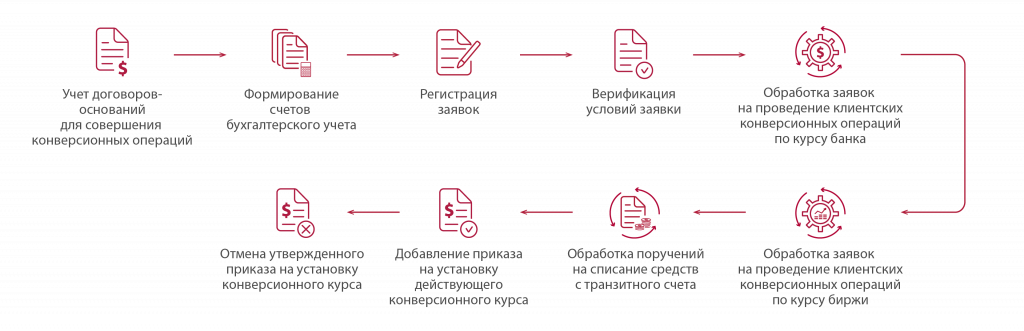 1. Учет договоров-оснований для совершения конверсионных операций 2. Формирование счетов бухгалтерского учета 3. Регистрация заявок 4. Верификация условий сделки 5. Обработка заявок на проведение клиентских операций по курсу банка 6. Обработка заявок на проведение клиентских операций по курсу биржи 7. Обработка поручений на списание средств с транзитного счета 8. Добавление приказа на установку действующего конверсионного курса 9. Отмена утвержденного приказа на установку конверсионного курса Клиентские конверсионные операции